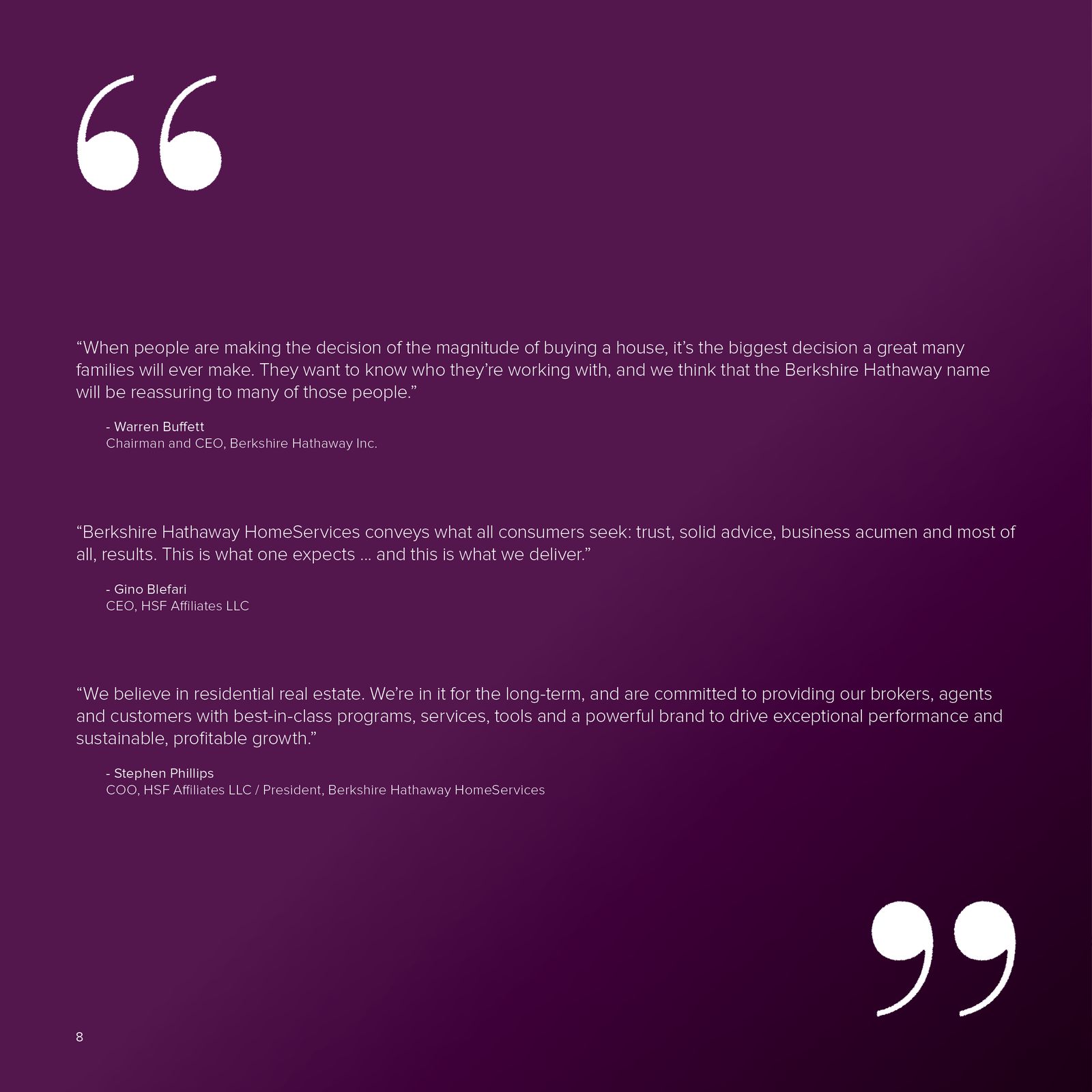 Warren Buffett received no compensation or benefit from BHH Affiliates, LLC in exchange for the statements used in this brochure. Used with permission.